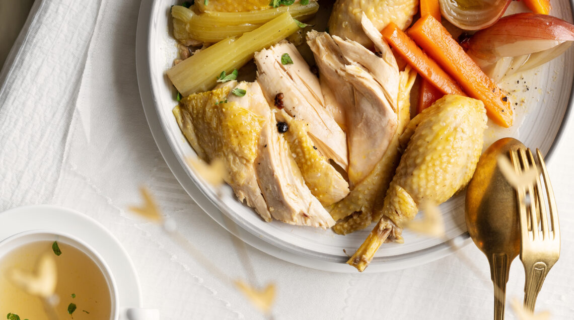 3) Portate a ebollizione abbondante acqua con un pizzico di sale, le carote, il sedano e la cipolla mondati e tagliati in grossi pezzi e immergetevi il cappone sgocciolato dalla marinata. Fate sobbollire a fiamma dolcissima per un paio di ore, quindi lasciate intiepidire un po' il cappone nel brodo di cottura prima di scolarlo e servirlo insieme alle verdure lessate. Accompagnatelo con la salsa di sedano rapa e i pickles alla vaniglia.