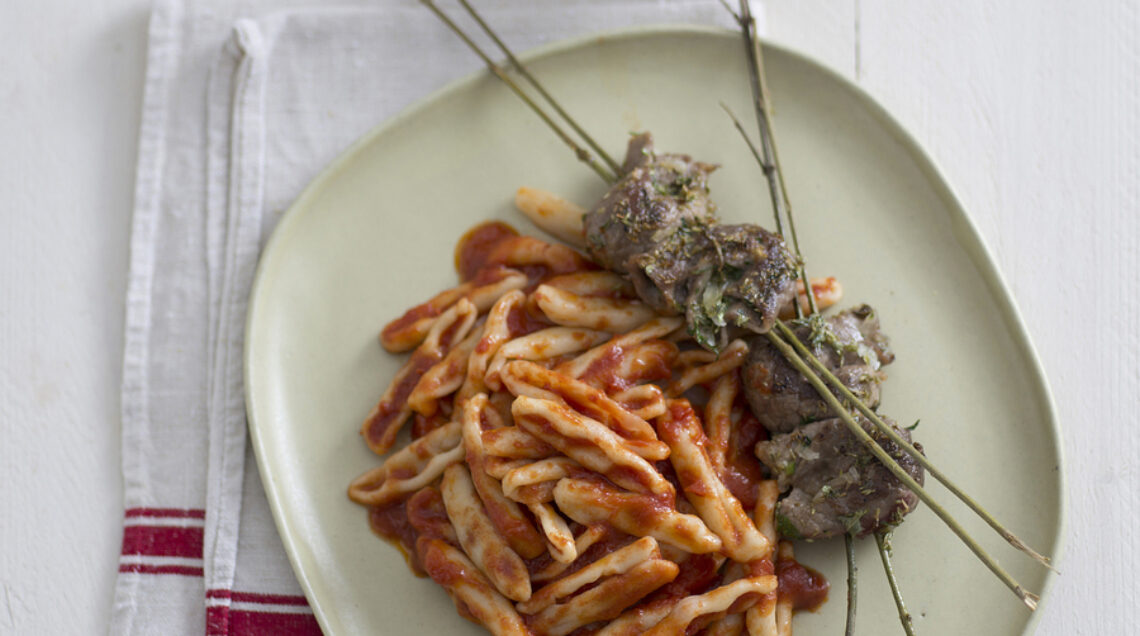 I capunti, anche conosciuti come cavatelli, sono una pasta fatta in casa di antichissima tradizione. In questa ricetta sfiziosa vengono conditi con del sugo di pomodoro e degli spiedini di coppa ripieni di formaggi.