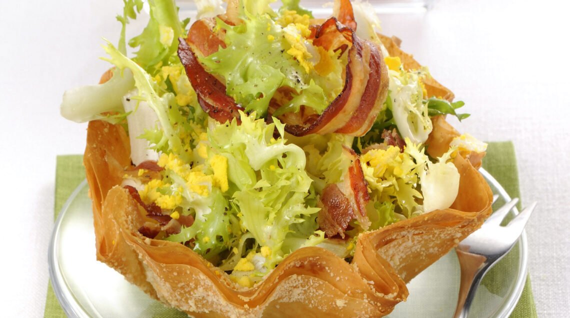 2) Pulite il cuore di un cespo di insalata riccia. Rosolate 100 g di pancetta affumicata a dadini in una padella con uno spicchio d'aglio e fatela asciugare sulla carta da cucina. Rassodate un uovo, setacciate il tuorlo, salate, aggiungete 2 cucchiai di aceto, uno di erba cipollina tritata, 3 di olio e versate sull'insalata. Unite la pancetta e servite.