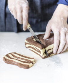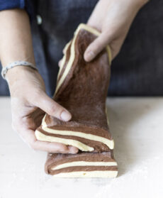Sovrapponete le 4 strisce, alternando i colori, quindi tagliate a metà il panetto ottenuto e sovrapponete le due metà.