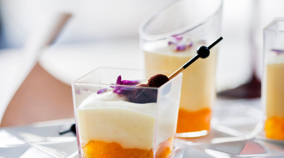 4) In 8 bicchierini poni la composta di arance, aggiungi la crema e poi uno stecchino con i piccoli bignè.