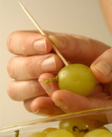 Lavate gli acini sotto l'acqua corrente e asciugateli con un canovaccio; quindi punzecchiateli in più punti con uno stecchino, in modo che possano cedere il loro succo e assorbire l'alcol.