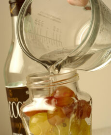 Versate l'alcol nei vasi, coprendo interamente la frutta; chiudeteli ermeticamente e scuoteteli un paio di volte per distribuire uniformemente lo zucchero. Lasciate riposare al fresco e al buio per 2 mesi prima del consumo.