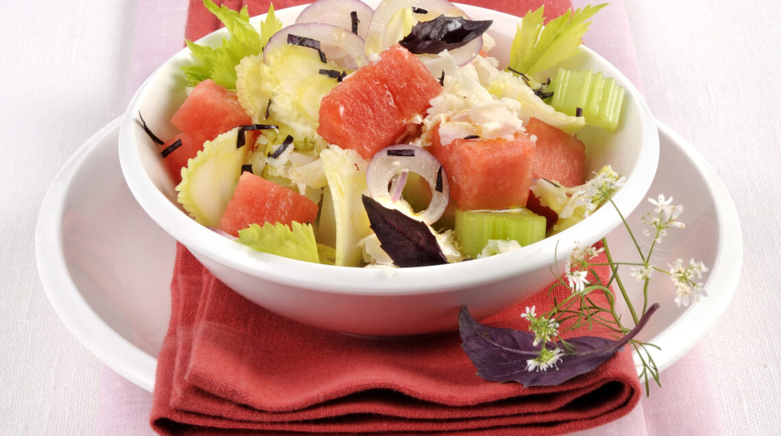 1) Taglia a dadini una fetta di anguria ed elimina tutti i semi. Affetta un cuore di sedano e un grosso cipollotto di Tropea.