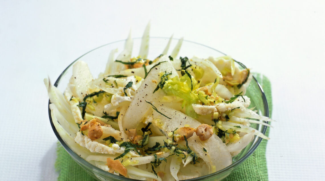3) Lava e affetta fini i finocchi, taglia a fette sottili le cime di cavolfiore, taglia i cuori di sedano a bastoncini e poi a metà se troppo lunghi. Sbuccia le pere, privale del torsolo e tagliale a fettine.