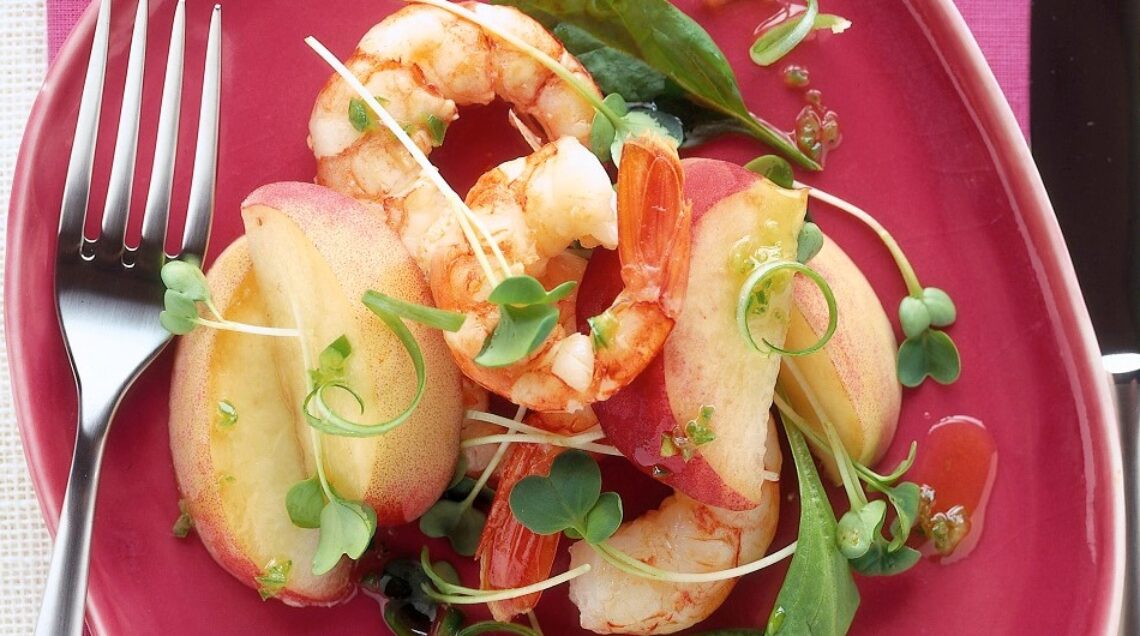 4 Lavate le pesche e, senza sbucciarle, tagliatele a spicchi grossi. Sgocciolate i cipollotti e asciugateli. Mescolate tra loro tutti gli ingredienti preparati, condite con la citronnette al peperoncino e lasciate insaporire l'insalata per una decina di minuti prima di servire.
