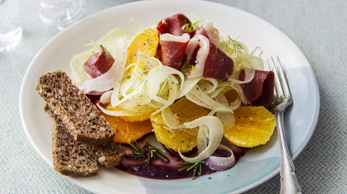 Una proposta gourmand per la tavola delle Feste: ciuffi di finocchio, rondelle di agrumi e un salume speciale profumato con un vino liquoroso
