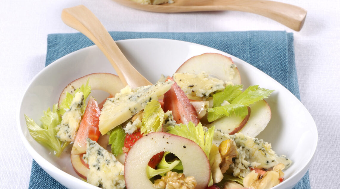 4) Distribuisci l'insalata nei piatti e completa con 200 g di stilton a scaglie.