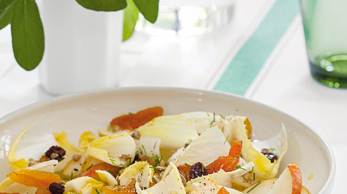 5) Mescola la belga con le pere e la frutta secca e aggiungi l’erba cipollina tagliuzzata.