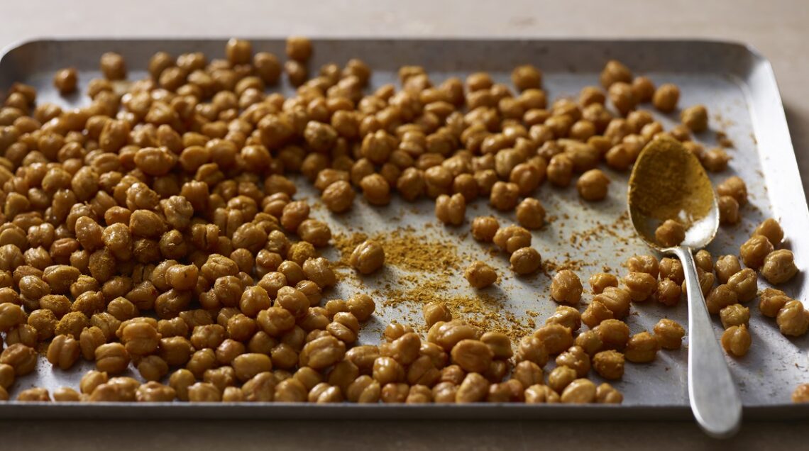 2 Togliete i ceci dal forno e cospargeteli con il curry (oppure un cucchiaio di paprica affumicata o mezzo cucchiaino di peperoncino in polvere o in fiocchi).