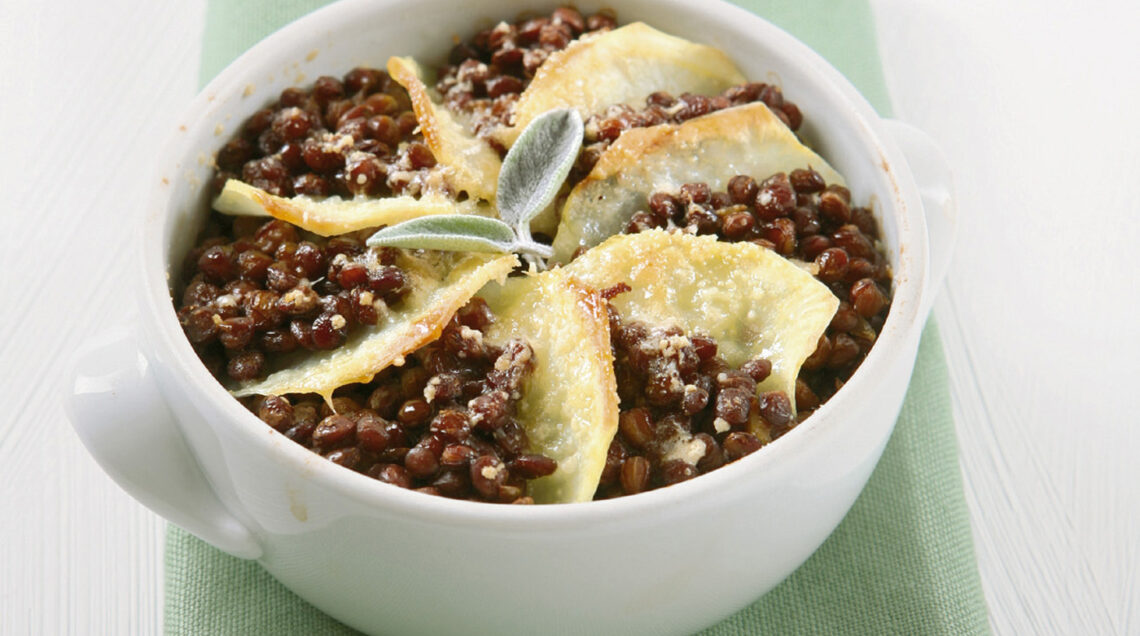 2) Ungi 4 pirofile con burro e disponi sul fondo 1/3 delle patate. Prosegui con lenticchie e procedi con gli strati, fino a esaurire gli ingredienti, terminando con spicchietti di patata. Spolverizza con burro e con parmigiano reggiano grattugiato. Cuoci le lenticchie con patate in forno a 180°C per 15 minuti.
