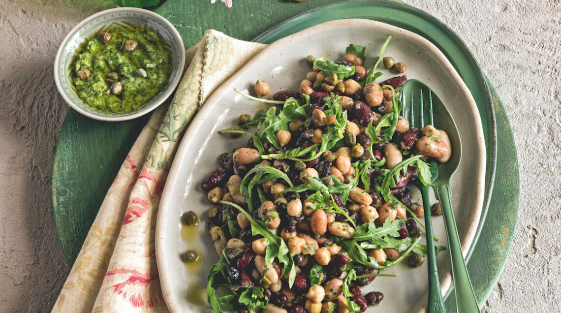 Protagonisti di questa ricetta i legumi, fagioli, cannellini, ceci, borlotti, esaltati dal sapore di un bagnetto speciale che condivide giusto il colore con quello tradizionale, piemontese, che accompagna il bollito misto. Mentre quello classico è a base di prezzemolo, quello qui proposto ha in più il sapore amarognolo della rucola e quello aromatico della salvia. Sentori intensi che si abbinano alla dolcezza dei legumi.