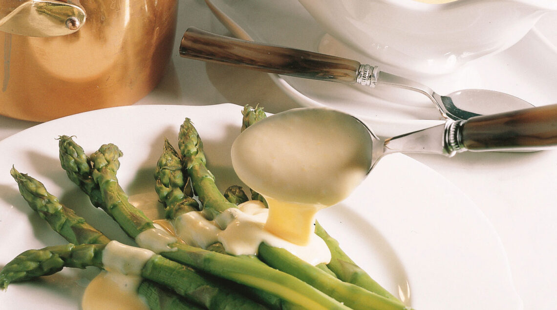 1) Per valorizzare il gusto naturale degli asparagi la cucina classica suggerisce di cuocerli al vapore e servirli con salsa olandese. Preparala così: emulsiona 2 tuorli con un pizzico di sale e pepe e un cucchiaio di aceto, metti il recipiente in un bagnomaria tiepido, poni su fuoco basso (l'acqua non deve mai bollire) e incomincia a montare con una frustina.