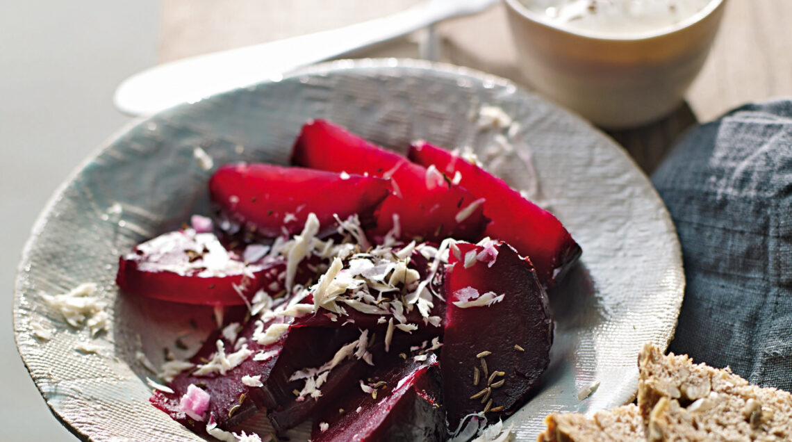 5) Tosta pochi istanti il kummel in una padellina antiaderente senza condimento. Cospargine 3/4 sulle barbabietole.