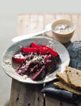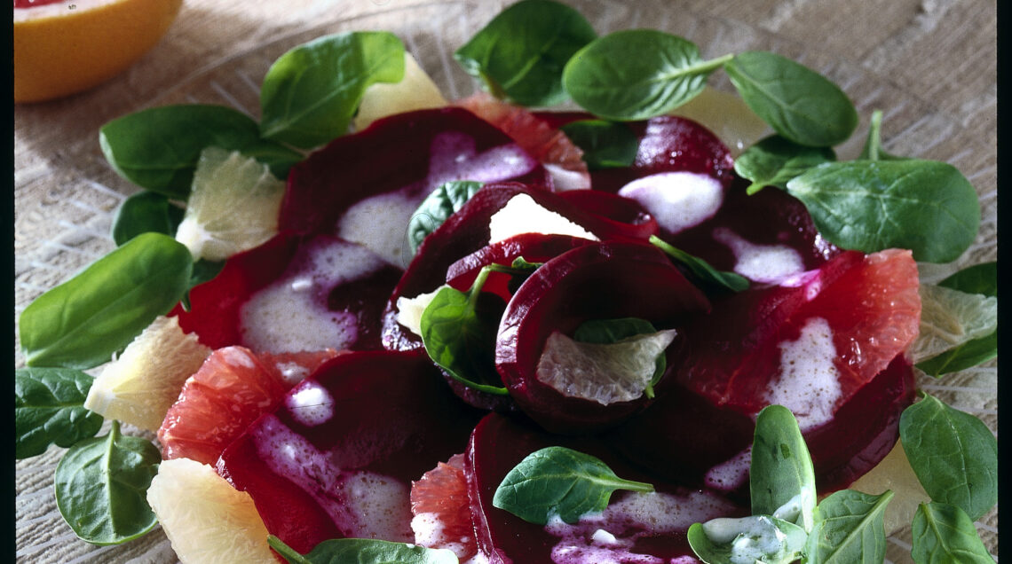 1) Per le barbabietole e spinacini con pompelmo, pela le barbabietole, tagliale a fette piuttosto sottili e suddividile in 4 piatti piani. Poi, pela al vivo i pompelmi, preleva gli spicchi e raccogli in una ciotola il succo.