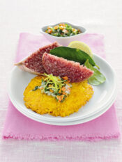 2) Nel frattempo trita 1 porro piccolo e soffriggilo in una padella capiente con 3 cucchiai di olio e l’aglio; quando diventa trasparente aggiungi 2 cucchiai di gomasio (semi di sesamo tostati) e 1 grossa manciata di erbe aromatiche (menta, maggiorana, salvia e rosmarino) tritate.