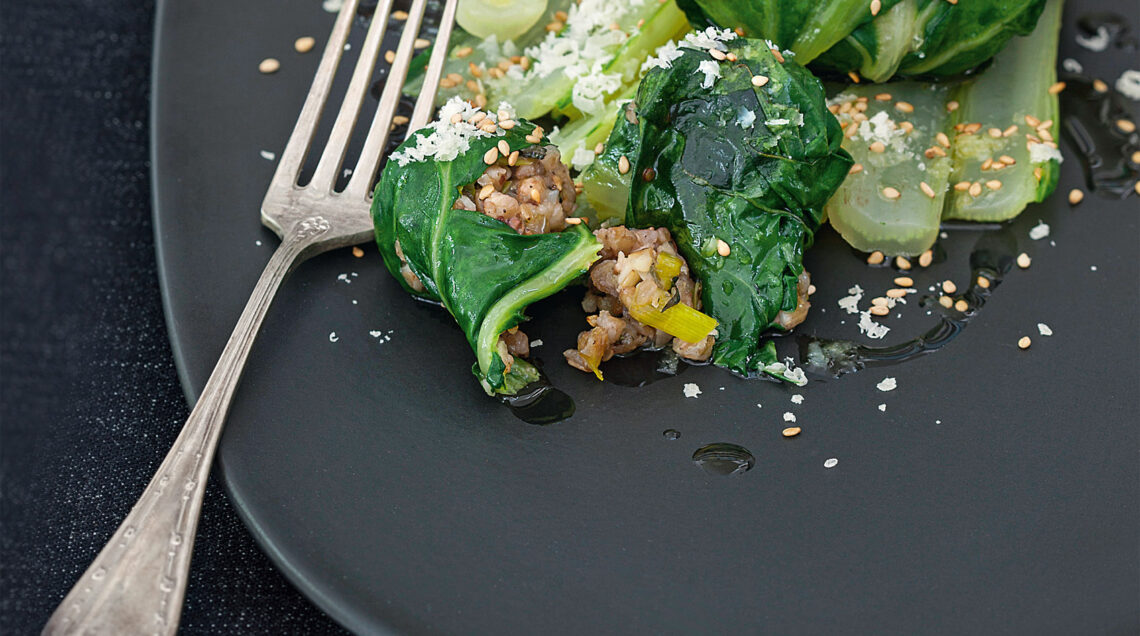 5) Stendi le foglie su un tagliere, metti al centro di ognuna una grossa noce di ripieno, arrotolale e ripiega con cura i bordi, in modo da formare tanti involtini ben chiusi. Falli rosolare con i gambi in una padella con l’olio rimasto, per una decina di minuti.