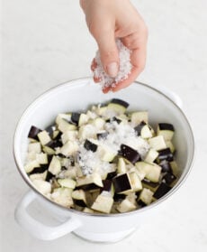 Per avere una perfetta caponata di melanzane, lavale, asciugale e tagliale a cubetti, poi salale e lasciale riposare per far loro perdere l’acqua vegetale.