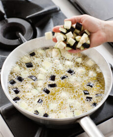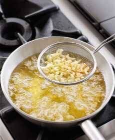 Taglia a fette il sedano e friggilo nell’olio delle melanzane.