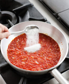 Elimina parte dell’olio e poi aggiungi della cipolla tritata finemente, aggiungi la polpa di pomodoro e cuoci per 10 minuti, quindi spolverizza con lo zucchero, bagna con l'aceto e cuoci fino ad avere una salsa concentrata.
