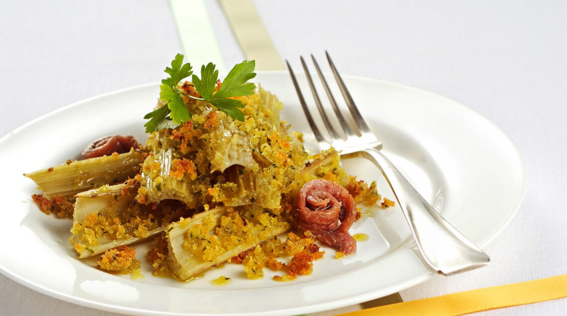 4) Scola i cardi, asciugali un po' con carta da cucina e sistemali su una placca unta d'olio; cospargili con il trito e passa sotto il grill per 10 minuti, o finché la superficie diventa dorata e croccante.
