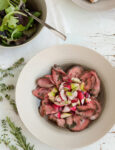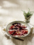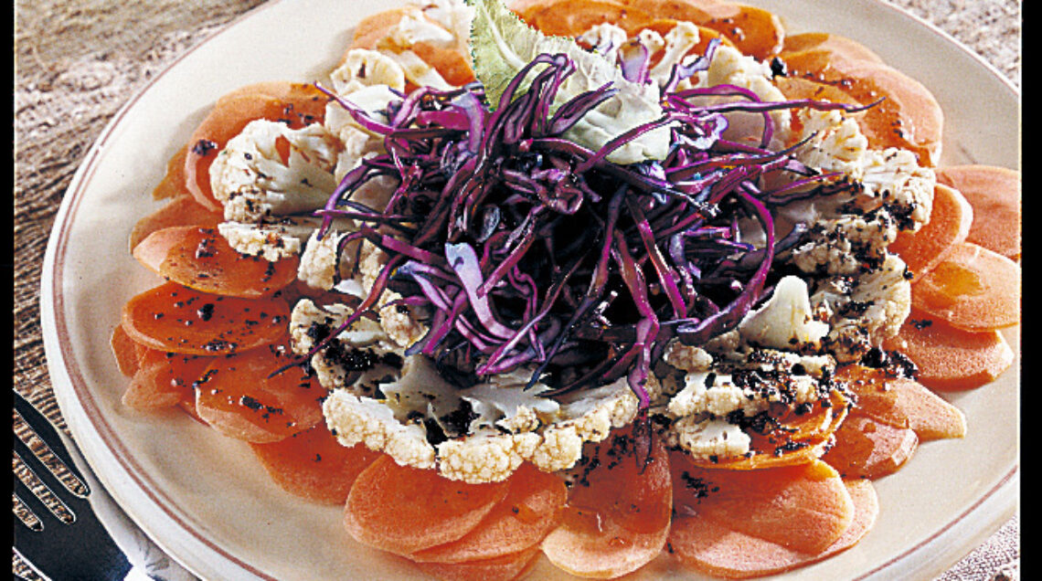 condimento caldo sulle verdure. Servi subito il carpaccio vegetariano con cavolo rosso.