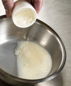 3) Versa la panna in una casseruolina con il glucosio (o lo zucchero), sale e pepe; porta a ebollizione, abbassa la temperatura a 60° (se non hai l'apposito termometro, togli dal fuoco e attendi 2-3 minuti), poi incorpora il formaggio.