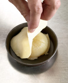 2) Ritaglia dalla pasta 4 dischi più o meno della larghezza dello stampino. Appoggia al centro di ogni stampino mezza cipolla con la parte tagliata verso il basso e coprila con un disco di pasta. Cuoci in forno a 160° per 20 minuti.