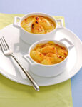 1) Fai sciogliere in una padella il burro con lo zucchero, porta a ebollizione, lascia sul fuoco finché si sarà formato un composto denso, poi spegni e lascia riposare. Intanto taglia le cipolle a metà, cuocile a vapore e asciugale bene. Prendi 4 stampini antiaderenti da tartelletta e metti in ciascuno un cucchiaio del composto.