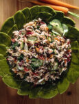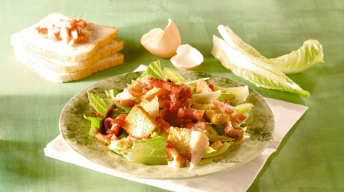 3) Condisci e servi. Poni la lattuga nei piatti, condiscila con la salsa, i filetti d'acciuga a pezzi, i crostini, la pancetta e il parmigiano rimasto, a scaglie. Servi la Caesar salad come sfizioso contorno.