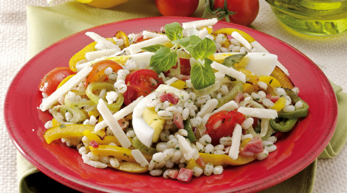 5) Tagliate a striscioline sottili il pecorino, aggiungetelo all'insalata di farro arlecchino e portate in tavola.