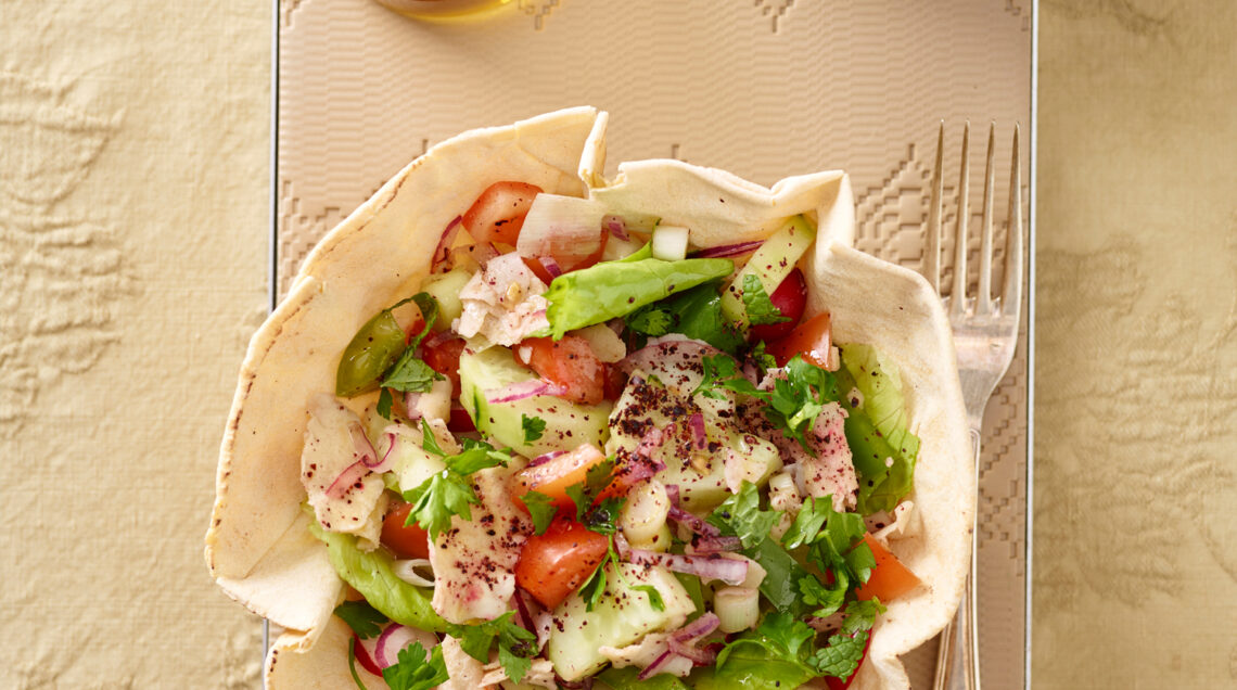 Il Fattoush che significa pane inumidito, è un piatto libanese, ricco di verdure, servito come antipasto o contorno, profumato con foglie di menta per rendere la preparazione fresca, adatta ai pasti delle giornate calde. È preparato con pane arabo tostato. Se lo trovate, usate il pane arabo piatto o la pitta, tipica delle regioni del Mediterraneo; potete sostituirli con piadina o spianata sarda.