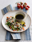3 Frullate in un mixer le olive, i capperi, il prezzemolo, il basilico, il succo di limone, il pepe e l'olio, fino a ottenere una salsa omogenea; versatela in una ciotola. Scolate le verdure, mettetele in una ciotola e guarnitele, se vi piace, con olive e filetti d'acciuga.