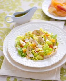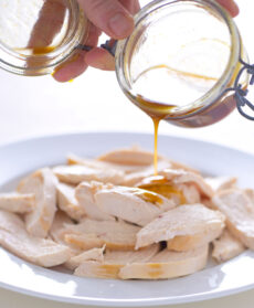 Condisci - Versa nel vasetto a chiusura ermetica 3 cucchiai di olio con 1-2 di aceto balsamico, un pizzico di sale e una macinata di pepe. Chiudi e agita con decisione. Condisci il pollo con la vinaigrette preparata e mescolalo con la frutta disidratata.