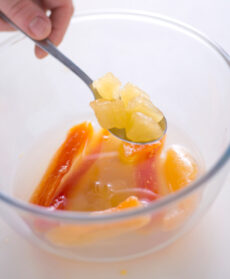 Prepara gli ingredienti - Versa in una ciotola un bicchiere abbondante di vino e 1 cucchiaio di acqua tiepida, aggiungi lo zucchero e il succo di limone e fai ammorbidire la frutta disidratata (mango, papaya, ananas e zenzero) per 10-15 minuti. Intanto lava il petto di pollo e asciugalo. Dividilo in 2 filetti, incidendolo al centro, nel senso della lunghezza. Elimina la cartilagine, l'ossicino centrale ed eventuali parti grasse. Pulisci la carota, il sedano e la cipolla. Lavali e tagliali a pezzi. Sgocciola la frutta disidratata, asciugala e tagliala a pezzetti.