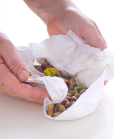 Cuoci la carne - Porta a bollore in una pentola 2 l d'acqua con le verdure, cuoci per 20 minuti, regola di sale, tuffaci i filetti di pollo e cuocili per 10 minuti. Intanto, scotta i pistacchi in acqua bollente per 1-2 minuti, sgocciolali e strofinali dentro un telo, per eliminare le pellicine. Togli dal fuoco la pentola con i filetti di pollo e lasciali nel loro brodo di cottura finchè saranno