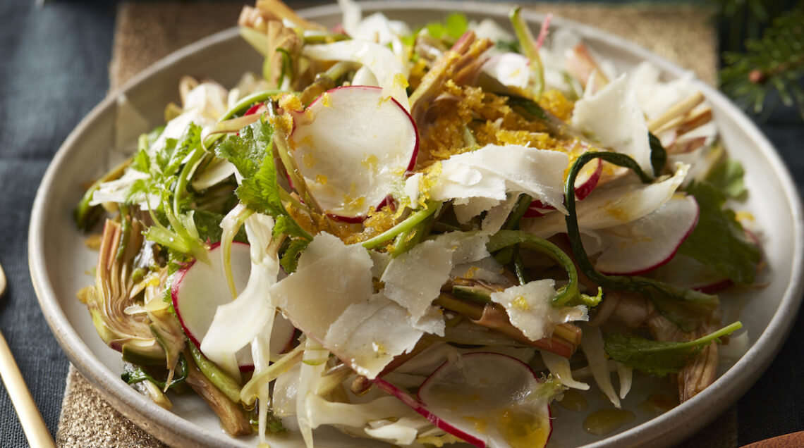 Un piccolo capolavoro che coniuga verdure invernali con ortaggi primaverili: all'insegna della croccantezza e sotto il tocco sapido e inimitabile della bottarga di muggine
