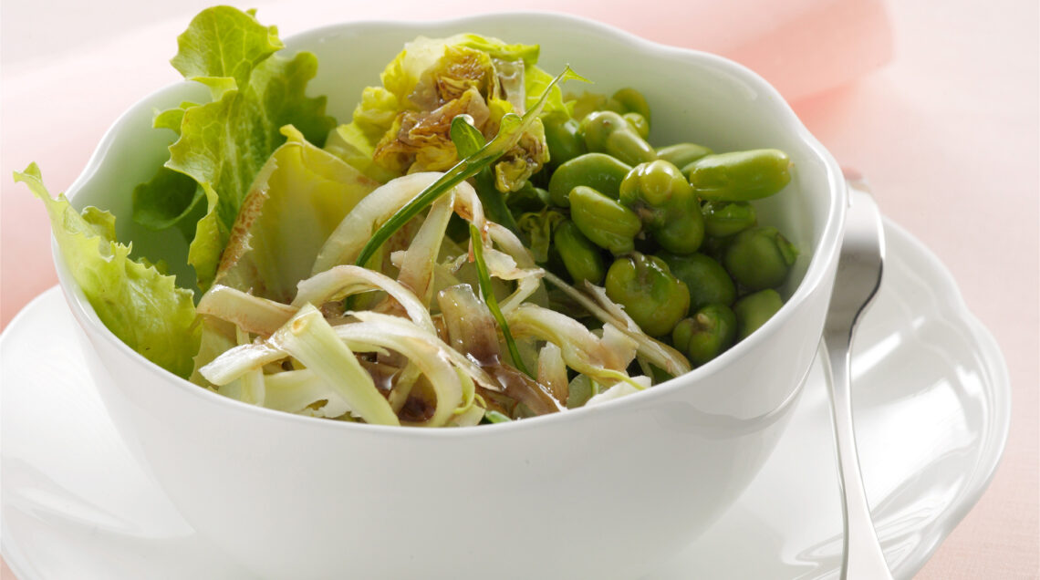 Un mix in verde perfetto come antipasto, contorno o leggero secondo detox. Le insalate, lollo, belga e pan di zucchero, e le puntarelle sono rinforzate da fave crude, il condimento semplicissimo porta l'aroma dell'aceto balsamico. È un'insalata perfetta anche per un pic nic, da condire solo al momento di servire per evitare che perda croccantezza.