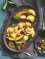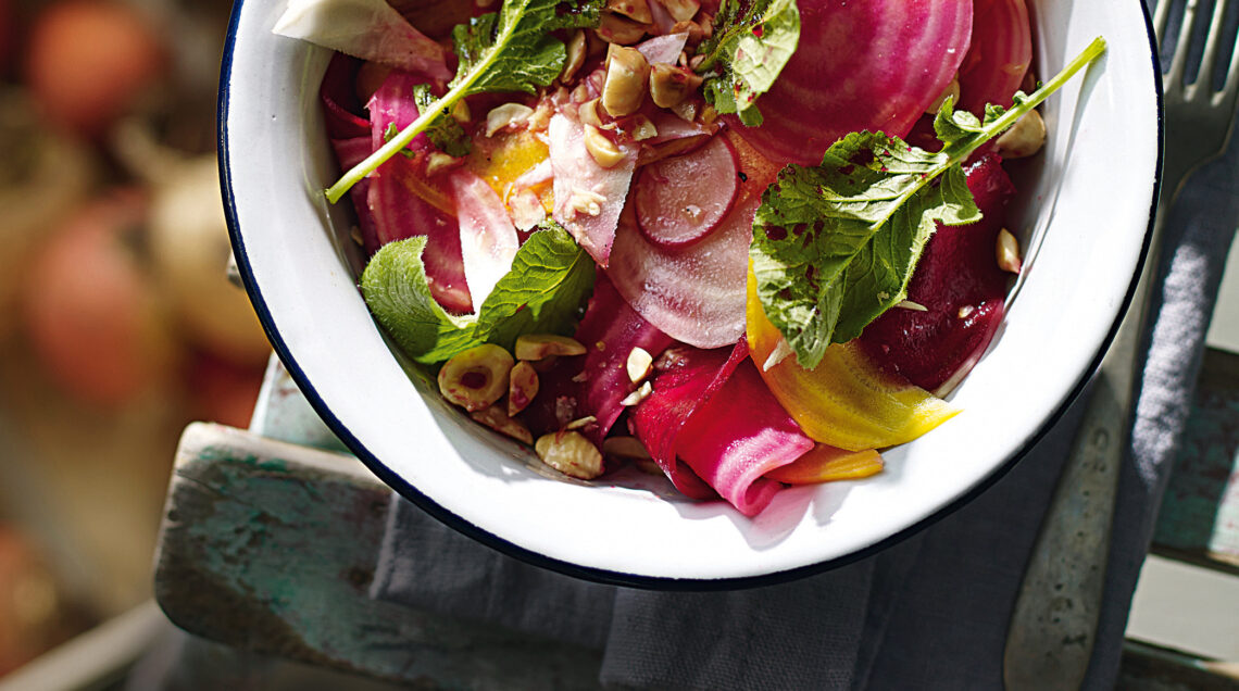 7) Riunisci le barbabietole rosse alle altre radici, aggiungi il verde dei ravanelli, le nocciole e 2 cucchiai di olio di nocciole. Servi, se ti piace, con ricotta di pecora freschissima o caprino non stagionato.