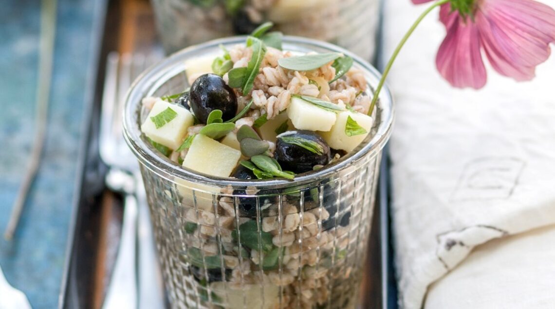 3) Mescolate il farro con la dadolata di pecorino e verdure, unite 1 mazzetto di rucola selvatica e 1 mazzetto di portulaca (facoltativo) e condite con 4 cucchiai di olio e sale.