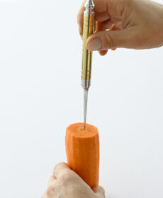 1) Pela e spunta una grossa carota, poi tagliala a tronchetti di 5-6 cm; infila la lama di un bisturi da cucina (o coltello tailandese) al centro di un tronchetto e falla ruotare intorno al torsolo in modo da inciderne i contorni, quindi con un lungo scavino a V pratica, a raggiera, un primo giro di piccole incisioni