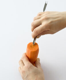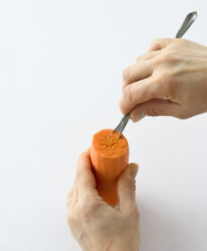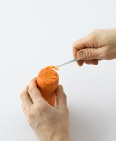 2) Con uno scavino a U incidi quindi i petali arrivando ai bordi del tronchetto di carota