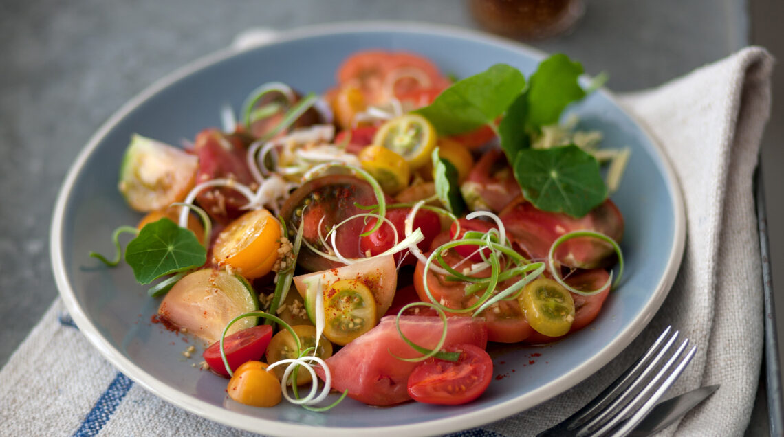 Un mix goloso di pomodori in insalata, insaporiti con cipollotto, zenzero e salsa di soia. La leggerezza è servita