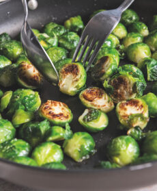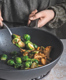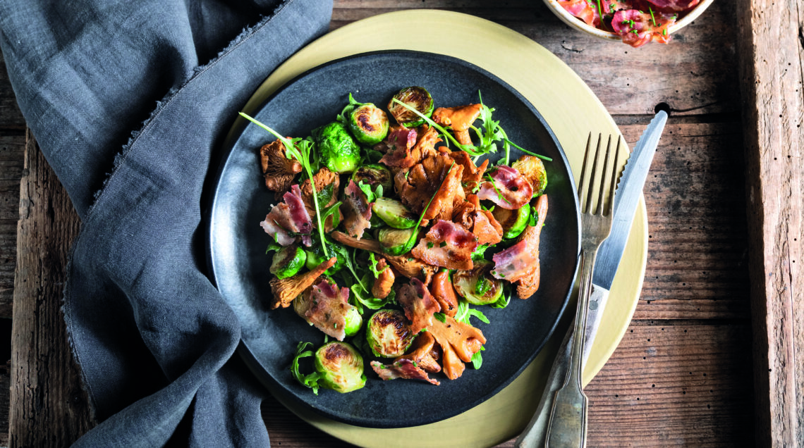 Aggiungete i cavolini, mescolate e trasferite in un piatto da portata. Unite i funghi, la pancetta spezzettata, un trito fine di erba cipollina e le foglie di rucola. Pepate e servite, a piacere, con riso pilaf o crostoni di polenta.