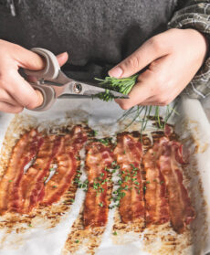 In una seconda padella fate rosolare le fette di pancetta, poi trasferitele su carta da cucina. Nella stessa padella aggiungete poco olio, il trito di scalogno e i funghi. Salate, pepate e cuocete per 10 minuti a fuoco vivace, mescolando spesso. Sfumate con il vino.