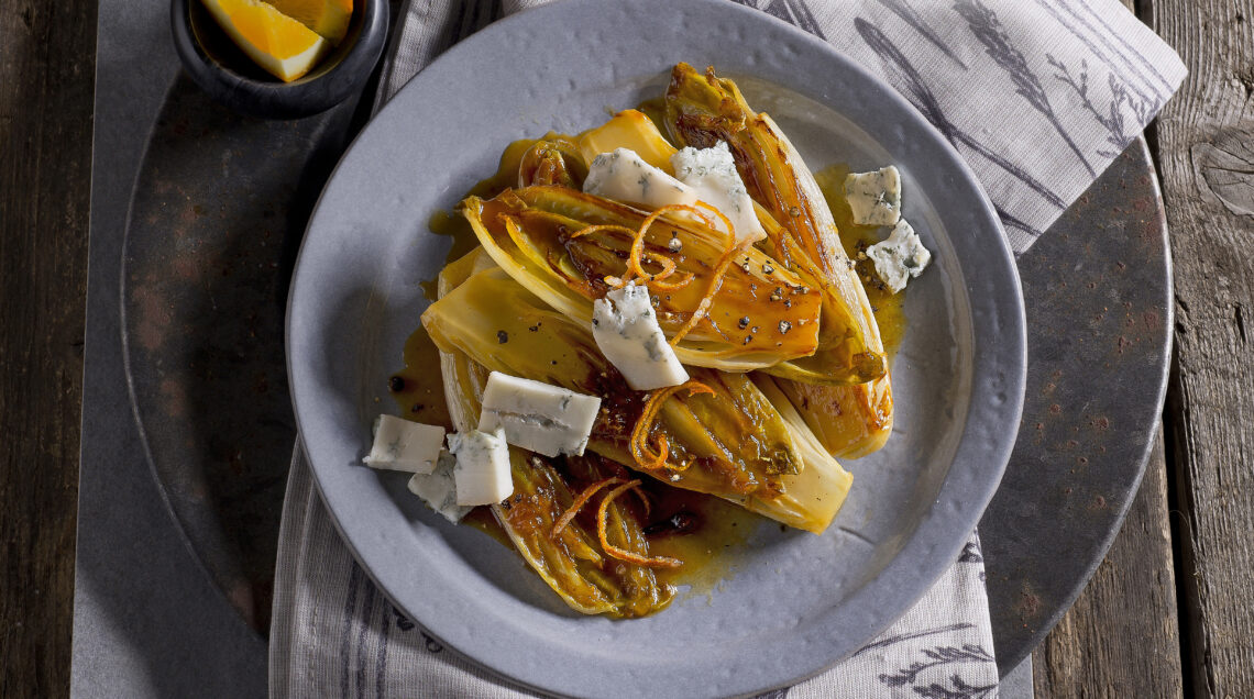 I cespi di insalata sono caramellati nel burro e miele e profumati con succo e scorza di arancia. L'incontro con la sapidità del formaggio di capra è irresistibile