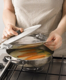 Coprite il tegame con un foglio di alluminio e con il coperchio e fate prendere l'ebollizione; abbassate la fiamma e continuate la cottura per circa 30 minuti, finché le carote sono tenere unendo, se necessario, altro latte caldo. Scolatele carote, fate ridurre il sugo di cottura, filtratelo e versatelo sulle carote; servite.