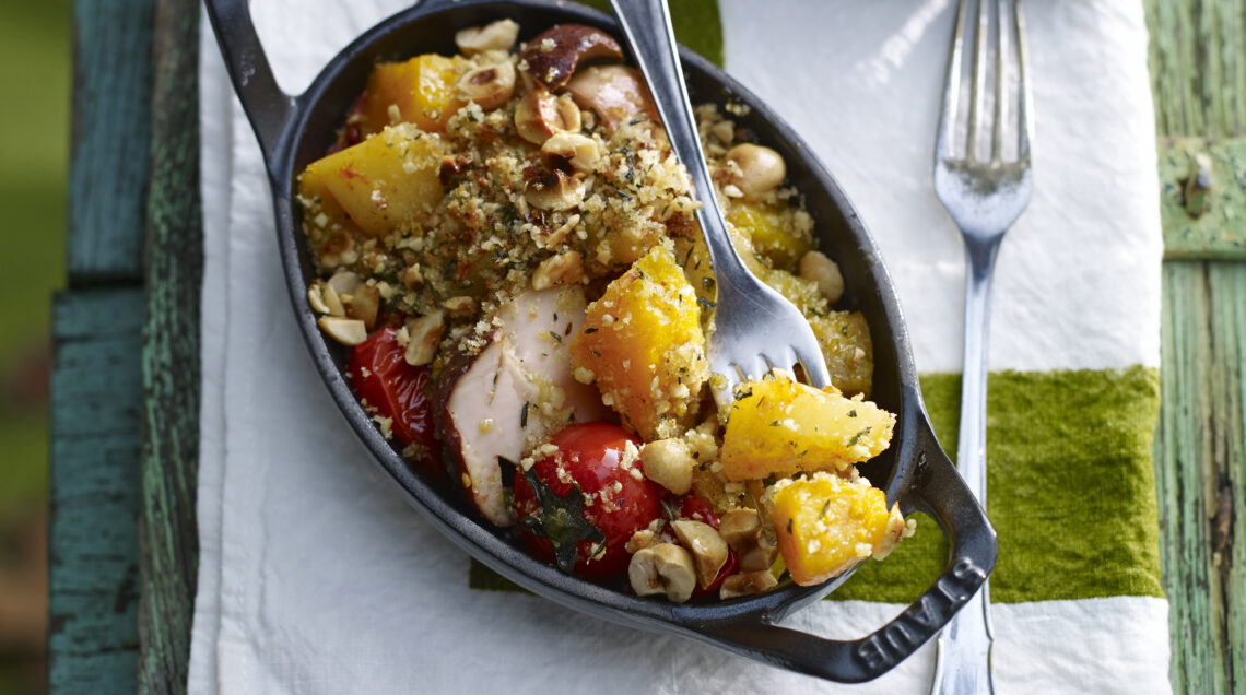 3) Trita il pane nel mixer con 2/3 delle nocciole, 5 cucchiai d'olio e le foglie di maggiorana. Trasferisci le verdure in 4 pirofile da porzione, cospargile con il trito preparato e le nocciole rimaste spezzettate, poi passa il crumble sotto il grill del forno per 3-4 minuti e servi.