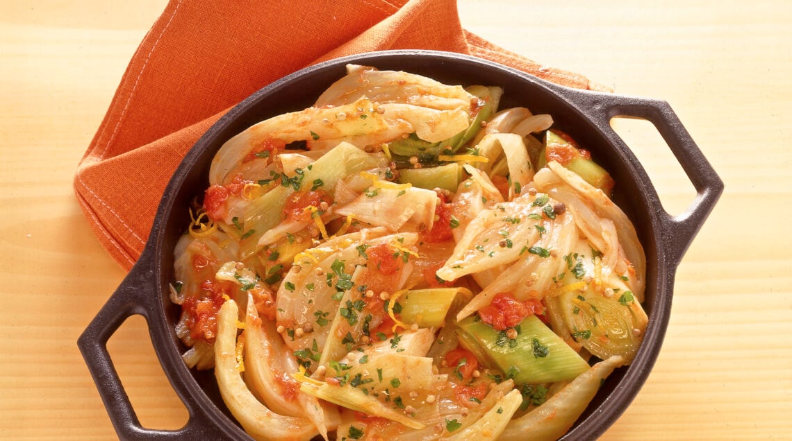 1) Per i finocchi e porri agli aromi, pulisci i finocchi, eliminando le parti dure e filamentose, e tagliali a spicchi delle stesse dimensioni. Elimina parzialmente la parte verde dei porri e lo strato più esterno, poi lavali e riducili a tocchetti di circa 3 cm.