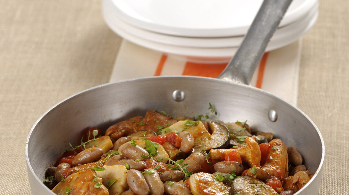 2) Monda 200 g di porcini e 200 g di finferli. Taglia i funghi a fette spesse, dorate in una padella uno spicchio di aglio con 4 cucchiai di olio, unisci i funghi, una manciatina di foglie di timo e cuoci a fuoco vivace per 3 minuti. Sala i funghi, aggiungi i perini spezzettati, abbassa la fiamma e lascia cuocere 10 minuti a fuoco medio.